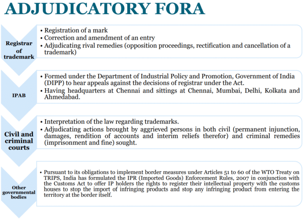 Multi-tier enforcement mechanism – Registrar, intellectual property appellate board (IPAB), civil and criminal courts;