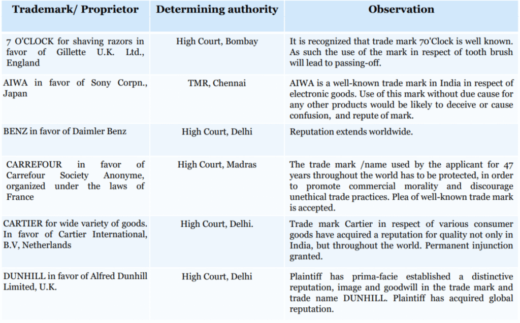 IPAB maintains a list of well-known trademarks in India as accorded recognition by the various fora; Illustratively: